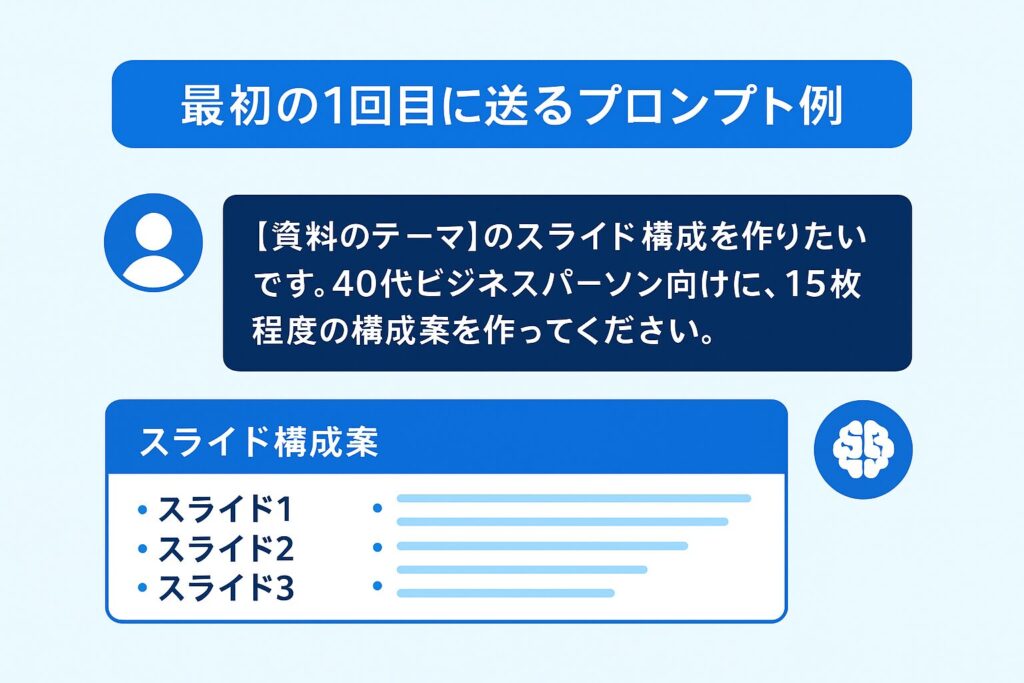 1枚ごとに『スライドタイトル』『入れる要点(箇条書き3つ程度)』を出力してください。」
