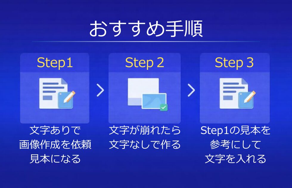 - 文字が崩れたら、文字なしで同じ構図を作り直す